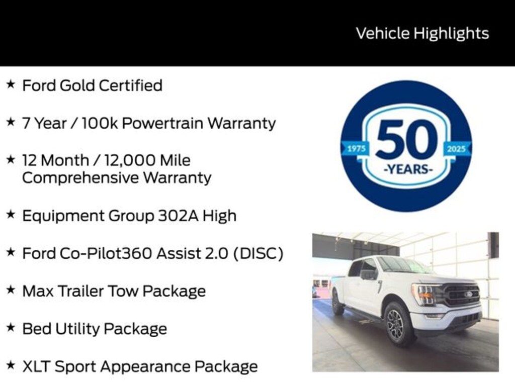 Recent Arrival! 2022 Ford F-150 XLT 3.5L V6 EcoBoost 10-Speed Automatic 4WD 4D SuperCrew Oxford White Ford Gold Certified, 7 Year / 100k Powertrain Warranty, 12 Month / 12,000 Mile Comprehensive Warranty, 10-Way Power Driver & Passenger Seats, 8" Productivity Screen in Instrument Cluster, Accent-Color Step Bars, Bed Utility Package, Black 2-Bar Style Grille w/Black Surround/Accents, Body-Color Door & Tailgate Handles, Body-Color Front & Rear Bumpers, Box Side Decals, BoxLink, Chrome Single-Tip Exhaust, Connected Built-In Navigation (DISC), Dual Zone Electronic Automatic Temperature Control, Electronic Locking w/3.55 Axle Ratio, Equipment Group 302A High, Evasive Steering Assist, Extended Range 36 Gallon Fuel Tank, Exterior Parking Camera Rear, Ford Co-Pilot360 Assist 2.0 (DISC), Front fog lights, GVWR: 7,150 lbs Payload Package, Heated Front Seats, Integrated Trailer Brake Controller, Intelligent Access w/Push Button Start, Intelligent Adaptive Cruise Control w/Stop & Go, Intersection Assist, Leather-Wrapped Steering Wheel, LED Box Lighting, LED Reflector Headlamps, LED Sideview Mirror Spotlights, Max Trailer Tow Package, Onboard 400W Outlet, Power Glass Heated Sideview Mirrors, Power windows, Power-Adjustable Pedals, Power-Sliding Rear Window, Pro Trailer Backup Assist, Radio: AM/FM SiriusXM w/360L, Rear Under-Seat Storage, Remote keyless entry, Remote Start System w/Remote Tailgate Release, SYNC 4 w/Enhanced Voice Recognition, Tailgate Step w/Tailgate Work Surface, Unique Sport Cloth 40/Console/40 Front-Seats, Wheels: 18" 6-Spoke Machined Aluminum, XLT Sport Appearance Package, Zone Lighting.