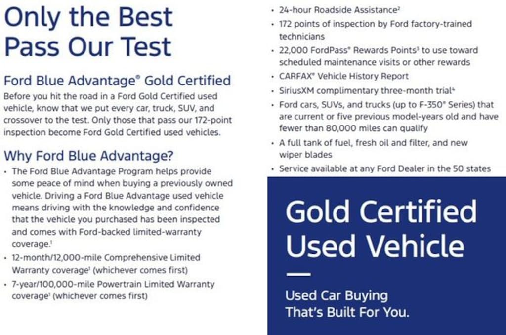 Buy With Confidence--This vehicle is Ford Gold certified. Service available at any Ford Dealer in the 50 states. 22,000 FordPass Rewards Points to use toward scheduled maintenance visits or other rewards, 12 months/12,000 miles (whichever comes first) Comprehensive Limited Warranty Coverage, 7-Year/100,000-Mile (whichever comes first) Powertrain Limited Warranty Coverage, Complimentary 24/7 Roadside Assistance for 7 years, Complimentary SiriusXM 3-month trial, CARFAX Vehicle History Report included, 172 Point Inspection Performed by Factory-Trained Technicians.