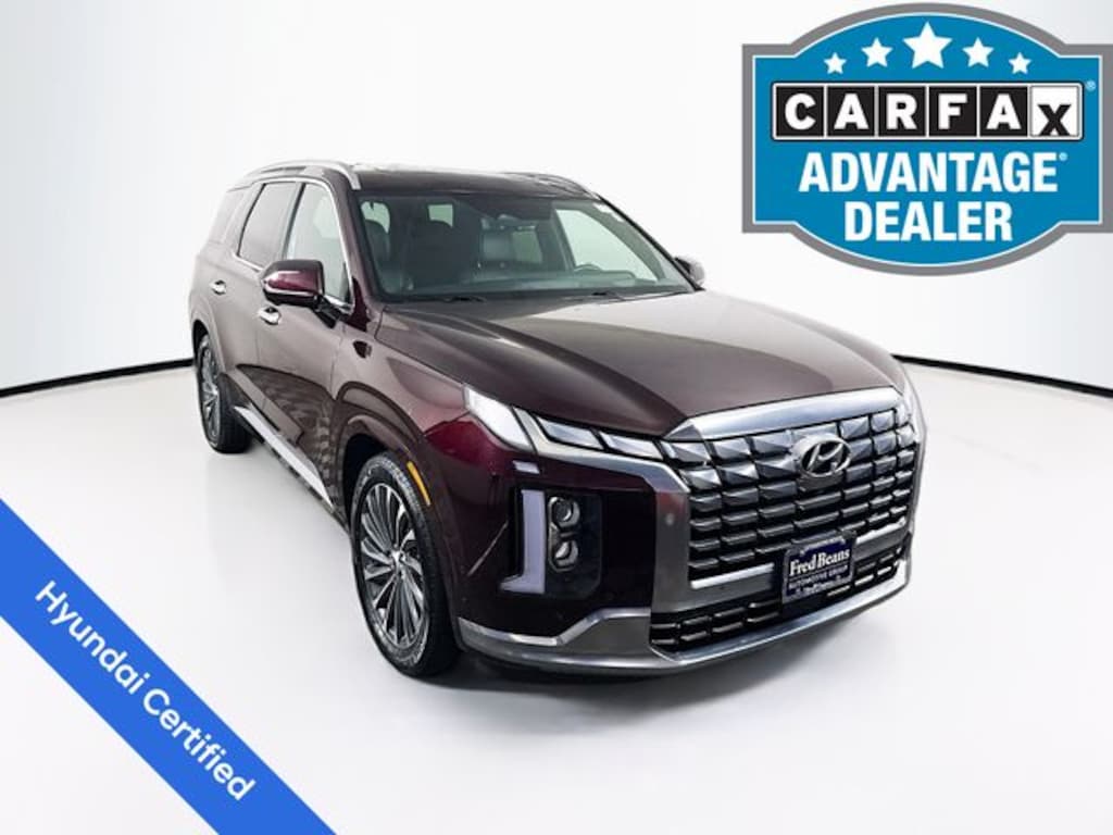 2024 Hyundai Palisade Calligraphy V6 8-Speed Automatic with SHIFTRONIC AWD 4D Sport Utility Sierra Burgundy Factory Certified Vehicle, Free First Oil Change, 5 Day Return / 30 Day Exchange, Auto Reward Program, AM/FM radio: SiriusXM, Apple CarPlay & Android Auto, Auto High-beam Headlights, Auto-dimming Rear-View mirror, Automatic temperature control, Exterior Parking Camera Rear, Front dual zone A/C, Fully automatic headlights, Garage door transmitter: HomeLink, harman/kardon® Speakers, Heads-Up Display, Heated & Ventilated Front Bucket Seats, Heated door mirrors, Heated front seats, Heated rear seats, Heated steering wheel, Memory seat, Navigation System, Option Group 01, Power door mirrors, Power driver seat, Power Liftgate, Power moonroof, Power passenger seat, Premium Nappa Leather Seat Trim, Rain sensing wipers, Remote keyless entry, Steering wheel mounted audio controls, Ventilated front seats, Ventilated rear seats.