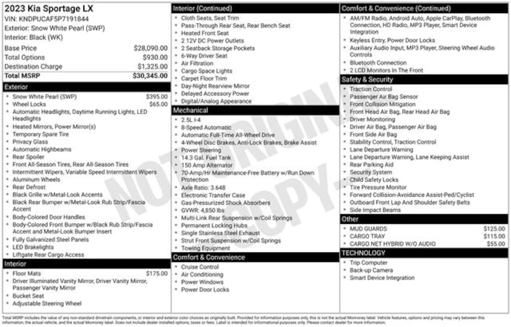Recent Arrival! 2023 Kia Sportage LX I4 8-Speed Automatic AWD 4D Sport Utility Snow White Pearl Kia Certified Pre-Owned Certified, AWD, 17" Alloy Wheels, 4-Wheel Disc Brakes, 6 Speakers, ABS brakes, Air Conditioning, Alloy wheels, AM/FM radio, Auto High-beam Headlights, Axle Ratio: 3.648, Brake assist, Bumpers: body-color, Cargo Net Hybrid w/o Audio, Cargo Tray, Carpeted Floor Mats, Cloth Seat Trim, Delay-off headlights, Driver door bin, Driver vanity mirror, Dual front impact airbags, Dual front side impact airbags, Electronic Stability Control, Four wheel independent suspension, Front anti-roll bar, Front Bucket Seats, Front Center Armrest, Fully automatic headlights, Heated door mirrors, Heated front seats, Illuminated entry, Low tire pressure warning, Mud Guards, Occupant sensing airbag, Outside temperature display, Overhead airbag, Overhead console, Panic alarm, Passenger door bin, Passenger vanity mirror, Power door mirrors, Power steering, Power windows, Radio: AM/FM/HD Audio System, Rear anti-roll bar, Rear seat center armrest, Rear window defroster, Rear window wiper, Remote keyless entry, Security system, Speed control, Speed-sensing steering, Split folding rear seat, Spoiler, Steering wheel mounted audio controls, Tachometer, Telescoping steering wheel, Tilt steering wheel, Traction control, Trip computer, Variably intermittent wipers, Wheel Locks, AWD.