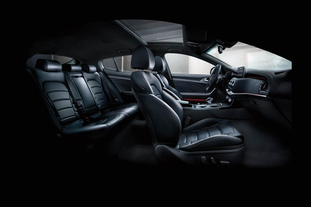 The Stinger has bucket seats in front and supplies 42.6 inches of legroom, 38.3 inches of headroom, 55.5 inches of hip room, and 56.4 inches of shoulder room to front-seat passengers. In the rear, even adult-sized passengers can enjoy 37 inches of headroom, 56.1 inches of hip room, 36.4 inches of legroom, and 54.8 inches of shoulder room.