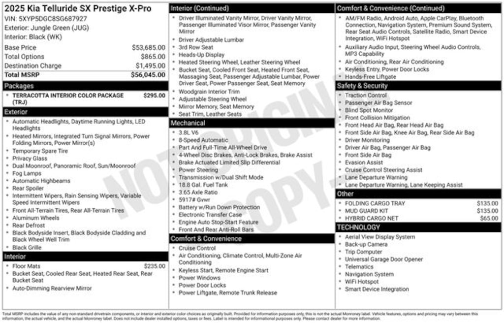 Visit our Website for a Complimentary CarFax Report!!!, Free First Oil Change, Auto Reward Program, 10 Speakers, 3rd row seats: split-bench, 4-Wheel Disc Brakes, ABS brakes, Air Conditioning, Alloy wheels, AM/FM radio: SiriusXM, Apple CarPlay & Android Auto, Auto High-beam Headlights, Auto-dimming Rear-View mirror, Auto-leveling suspension, Automatic temperature control, Brake assist, Bumpers: body-color, Carpeted Floor Mats, Compass, Delay-off headlights, Driver door bin, Driver vanity mirror, Dual front impact airbags, Dual front side impact airbags, Electronic Stability Control, Emergency communication system: 911 Connect, Exterior Parking Camera Rear, Folding Cargo Tray, Four wheel independent suspension, Front anti-roll bar, Front Bucket Seats, Front Center Armrest, Front dual zone A/C, Front fog lights, Front reading lights, Fully automatic headlights, Garage door transmitter: HomeLink, harman/kardon® Speakers, Heads-Up Display, Heated & Ventilated Front Bucket Seats, Heated door mirrors, Heated front seats, Heated rear seats, Heated steering wheel, Hybrid Cargo Net, Illuminated entry, Knee airbag, Leather Shift Knob, Leather steering wheel, Low tire pressure warning, Memory seat, Mud Guard Kit, Nappa Leather Seat Trim, Navigation System, Occupant sensing airbag, Outside temperature display, Overhead airbag, Overhead console, Panic alarm, Passenger door bin, Passenger vanity mirror, Power door mirrors, Power driver seat, Power Liftgate, Power moonroof, Power passenger seat, Power steering, Power windows, Radio data system, Radio: AM/FM Harman Kardon Audio System, Rain sensing wipers, Rear air conditioning, Rear anti-roll bar, Rear audio controls, Rear reading lights, Rear side impact airbag, Rear window defroster, Rear window wiper, Reclining 3rd row seat, Remote keyless entry, Security system, Speed control, Speed-sensing steering, Split folding rear seat, Spoiler, Steering wheel mounted audio controls, Tachometer, Telescoping steering wheel, Terracotta Interior Color Package, Tilt steering wheel, Traction control, Trip computer, Turn signal indicator mirrors, Variably intermittent wipers, Ventilated front seats, Ventilated rear seats, Wheels: 18" x 7.5" Black Finish X-PRO Exclusive. 2025 Kia Telluride SX-Prestige X-Pro SX-Prestige X-Pro 3.8L V6 DOHC AWD Jungle Green Price includes: $1000 - Sticker Sales Event Retail Bonus Cash. Exp. 01/02/2026 $2000 - KFA Dealer Choice Program: $2000 discount and 5.25% APR for 36 months. $30.08 per $1000 financed. Available to well qualified buyers who finance through Kia Finance America. 506. Exp. 01/02/2026