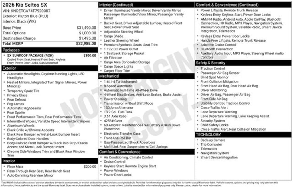 Visit our Website for a Complimentary CarFax Report!!!, Auto Reward Program, 4-Wheel Disc Brakes, 8 Speakers, ABS brakes, Air Conditioning, Alloy wheels, AM/FM radio: SiriusXM, Apple CarPlay & Android Auto, Artificial Leather Seat Trim, Auto High-beam Headlights, Auto-dimming Rear-View mirror, Automatic temperature control, Brake assist, Bumpers: body-color, Carpet Floor Mats, Delay-off headlights, Digital Key, Driver door bin, Driver vanity mirror, Dual front impact airbags, Dual front side impact airbags, Electronic Stability Control, Emergency communication system: 911 Connect, Exterior Parking Camera Rear, Four wheel independent suspension, Front anti-roll bar, Front Bucket Seats, Front Center Armrest, Front fog lights, Front reading lights, Fully automatic headlights, Heated door mirrors, Heated Front Bucket Seats (3-Steps), Heated front seats, Illuminated entry, Leather Shift Knob, Leather steering wheel, Low tire pressure warning, Navigation System, Occupant sensing airbag, Outside temperature display, Overhead airbag, Overhead console, Panic alarm, Passenger door bin, Passenger vanity mirror, Power door mirrors, Power driver seat, Power Liftgate, Power steering, Power Sunroof, Power windows, Radio: AM/FM/HD/Satellite Display System with Navigation, Rear seat center armrest, Rear window defroster, Rear window wiper, Remote keyless entry, Security system, Speed control, Speed-sensing steering, Split folding rear seat, Spoiler, Sport steering wheel, Steering wheel mounted audio controls, SX Sunroof Package, Tachometer, Telescoping steering wheel, Tilt steering wheel, Traction control, Trip computer, Turn signal indicator mirrors, Variably intermittent wipers, Ventilated Front Seats, Wheels: 18" Alloy with Machined Finish. 2026 Kia Seltos SX SX I4 AWD Pluton Blue Price includes: $1250 - KFA Dealer Choice Program: $1250 discount and 5.25% APR for 36 months. $30.08 per $1000 financed. Available to well qualified buyers who finance through Kia Finance America. 506. Exp. 03/02/2026