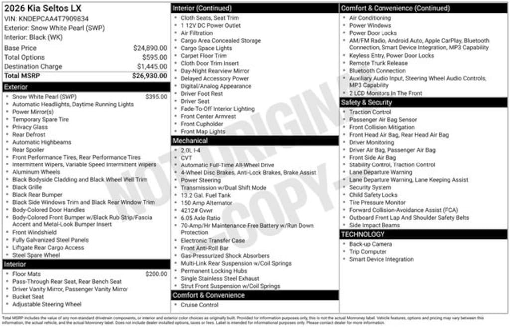 Visit our Website for a Complimentary CarFax Report!!!, Auto Reward Program, 4-Wheel Disc Brakes, 6 Speakers, ABS brakes, Air Conditioning, Alloy wheels, AM/FM radio, Apple CarPlay & Android Auto, Auto High-beam Headlights, Brake assist, Bumpers: body-color, Carpet Floor Mats, Cloth Seat Trim, Delay-off headlights, Driver door bin, Driver vanity mirror, Dual front impact airbags, Dual front side impact airbags, Electronic Stability Control, Exterior Parking Camera Rear, Four wheel independent suspension, Front anti-roll bar, Front Bucket Seats, Front Center Armrest, Front reading lights, Fully automatic headlights, Illuminated entry, Low tire pressure warning, Occupant sensing airbag, Outside temperature display, Overhead airbag, Overhead console, Panic alarm, Passenger door bin, Passenger vanity mirror, Power door mirrors, Power steering, Power windows, Radio: AM/FM Display Audio System, Rear window defroster, Rear window wiper, Remote keyless entry, Security system, Speed control, Speed-sensing steering, Split folding rear seat, Spoiler, Steering wheel mounted audio controls, Tachometer, Telescoping steering wheel, Tilt steering wheel, Traction control, Trip computer, Variably intermittent wipers, Wheels: 17" Alloy w/Dark Gray Finish. 2026 Kia Seltos LX LX 2.0L I4 MPI AWD Snow White Pearl Price includes: $750 - KFA Dealer Choice Program: $750 discount and 5.25% APR for 36 months. $30.08 per $1000 financed. Available to well qualified buyers who finance through Kia Finance America. 506. Exp. 02/02/2026