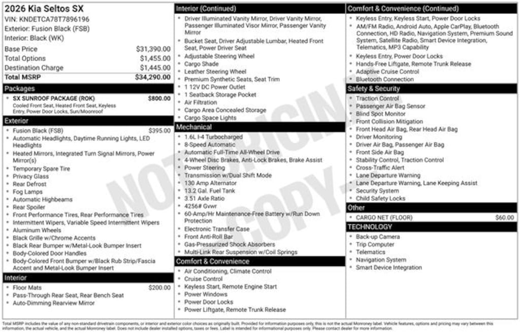 Visit our Website for a Complimentary CarFax Report!!!, Free First Oil Change, Auto Reward Program, 4-Wheel Disc Brakes, 8 Speakers, ABS brakes, Air Conditioning, Alloy wheels, AM/FM radio: SiriusXM, Apple CarPlay & Android Auto, Artificial Leather Seat Trim, Auto High-beam Headlights, Auto-dimming Rear-View mirror, Automatic temperature control, Brake assist, Bumpers: body-color, Cargo Net (Floor), Carpet Floor Mats, Delay-off headlights, Digital Key, Driver door bin, Driver vanity mirror, Dual front impact airbags, Dual front side impact airbags, Electronic Stability Control, Emergency communication system: 911 Connect, Exterior Parking Camera Rear, Four wheel independent suspension, Front anti-roll bar, Front Bucket Seats, Front Center Armrest, Front fog lights, Front reading lights, Fully automatic headlights, Heated door mirrors, Heated Front Bucket Seats (3-Steps), Heated front seats, Illuminated entry, Leather Shift Knob, Leather steering wheel, Low tire pressure warning, Navigation System, Occupant sensing airbag, Outside temperature display, Overhead airbag, Overhead console, Panic alarm, Passenger door bin, Passenger vanity mirror, Power door mirrors, Power driver seat, Power Liftgate, Power steering, Power Sunroof, Power windows, Radio: AM/FM/HD/Satellite Display System w/Navigation, Rear seat center armrest, Rear window defroster, Rear window wiper, Remote keyless entry, Security system, Speed control, Speed-sensing steering, Split folding rear seat, Spoiler, Sport steering wheel, Steering wheel mounted audio controls, SX Sunroof Package, Tachometer, Telescoping steering wheel, Tilt steering wheel, Traction control, Trip computer, Turn signal indicator mirrors, Variably intermittent wipers, Ventilated Front Seats, Wheels: 18" Alloy w/Machined Finish. 2026 Kia Seltos SX SX I4 AWD Fusion Black Price includes: $500 - KFA Dealer Choice Program: $500 discount and 5.25% APR for 36 months. $30.08 per $1000 financed. Available to well qualified buyers who finance through Kia Finance America. 506. Exp. 01/02/2026