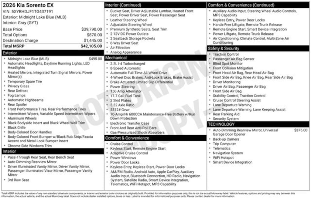Visit our Website for a Complimentary CarFax Report!!!, Free First Oil Change, Auto Reward Program, AWD, 3rd row seats: split-bench, 4-Wheel Disc Brakes, 6 Speakers, ABS brakes, Air Conditioning, Alloy wheels, AM/FM radio: SiriusXM, Apple CarPlay & Android Auto, Auto High-beam Headlights, Auto-Dimming Mirror w/HomeLink (PnP), Auto-dimming Rear-View mirror, Automatic temperature control, Brake assist, Bumpers: body-color, Delay-off headlights, Driver door bin, Driver vanity mirror, Dual front impact airbags, Dual front side impact airbags, Electronic Stability Control, Emergency communication system: 911 Connect, Exterior Parking Camera Rear, Four wheel independent suspension, Front anti-roll bar, Front Bucket Seats, Front Center Armrest, Front dual zone A/C, Front fog lights, Front reading lights, Fully automatic headlights, Heated door mirrors, Heated Front Bucket Seats, Heated front seats, Illuminated entry, Knee airbag, Leather Shift Knob, Leather steering wheel, Low tire pressure warning, Navigation System, Occupant sensing airbag, Outside temperature display, Overhead airbag, Overhead console, Panic alarm, Passenger door bin, Passenger vanity mirror, Power door mirrors, Power driver seat, Power Liftgate, Power passenger seat, Power steering, Power windows, Radio data system, Radio: AM/FM Standard Sound System, Rear anti-roll bar, Rear reading lights, Rear seat center armrest, Rear side impact airbag, Rear window defroster, Rear window wiper, Remote keyless entry, Security system, Speed control, Speed-sensing steering, Split folding rear seat, Spoiler, Steering wheel mounted audio controls, SynTex Artificial Leather Seat Trim, Tachometer, Telescoping steering wheel, Tilt steering wheel, Traction control, Trip computer, Turn signal indicator mirrors, Variably intermittent wipers, Wheels: 20" Machine-Finished Gloss Black Alloy, AWD. 2026 Kia Sorento EX EX 2.5L I4 DGI Turbocharged DOHC 16V LEV3-SULEV30 281hp AWD Midnight Lake Blue Price includes: $2500 - KFA Dealer Choice Program: $2500 discount and 5.25% APR for 36 months. $30.08 per $1000 financed. Available to well qualified buyers who finance through Kia Finance America. 506. Exp. 01/02/2026