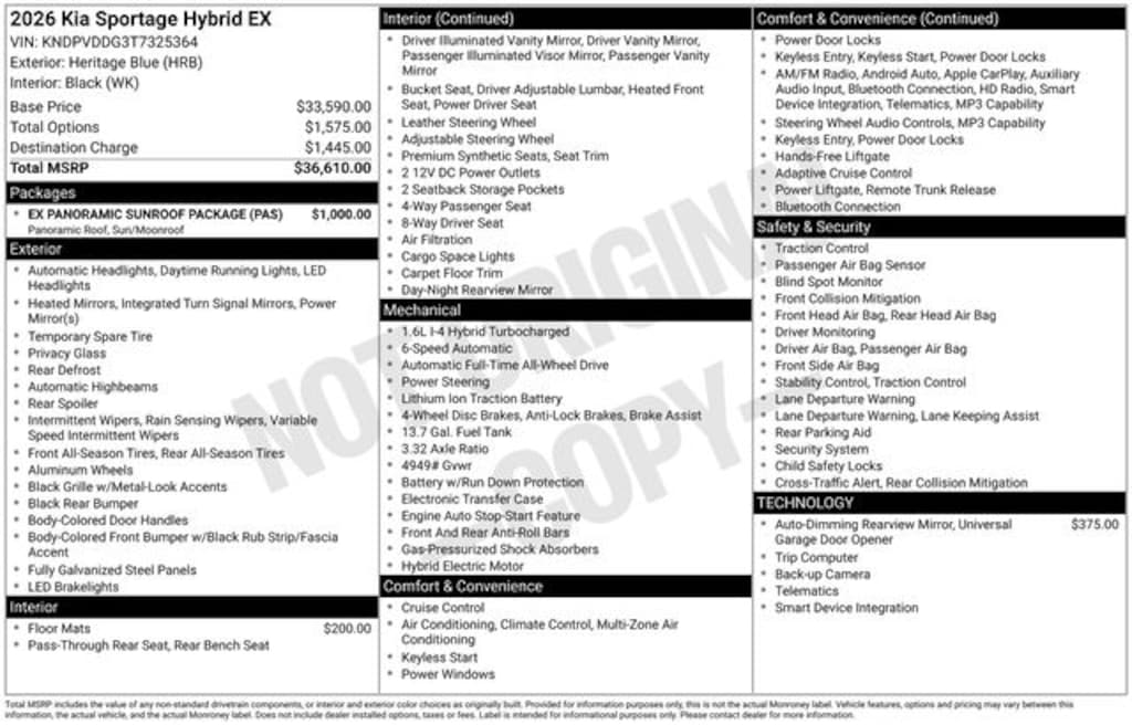 Visit our Website for a Complimentary CarFax Report!!!, Free First Oil Change, Auto Reward Program, 1.6L Turbo GDI 4-Cylinder, 4-Wheel Disc Brakes, 6 Speakers, ABS brakes, Air Conditioning, Alloy wheels, Auto High-beam Headlights, Auto-Dimming Mirror with HomeLink, Automatic temperature control, Brake assist, Bumpers: body-color, Carpeted Floor Mats, Delay-off headlights, Driver door bin, Driver vanity mirror, Dual front impact airbags, Dual front side impact airbags, Electronic Stability Control, Emergency communication system, EX Panoramic Sunroof Package, Four wheel independent suspension, Front anti-roll bar, Front Bucket Seats, Front Center Armrest, Front dual zone A/C, Fully automatic headlights, Heated door mirrors, Heated Front Bucket Seats, Heated front seats, Illuminated entry, Leather steering wheel, LED Interior Lighting, Low tire pressure warning, Occupant sensing airbag, Outside temperature display, Overhead airbag, Overhead console, Panic alarm, Panoramic Sunroof, Passenger door bin, Passenger vanity mirror, Power door mirrors, Power driver seat, Power Liftgate, Power steering, Power windows, Radio: AM/FM/HD Audio System, Rain sensing wipers, Rear anti-roll bar, Rear seat center armrest, Rear side impact airbag, Rear window defroster, Rear window wiper, Remote keyless entry, Security system, Speed control, Speed-sensing steering, Split folding rear seat, Spoiler, Steering wheel mounted audio controls, Syntex Leatherette Seat Trim, Tachometer, Telescoping steering wheel, Tilt steering wheel, Traction control, Trip computer, Turn signal indicator mirrors, Variably intermittent wipers, Wheels: 18" x 7.5J Machined Alloy, 1.6L Turbo GDI 4-Cylinder. 2026 Kia Sportage Hybrid EX EX 1.6L Turbo GDI 4-Cylinder AWD Heritage Blue Price includes: $1000 - KFA Dealer Choice Program: $1000 discount and 5.25% APR for 36 months. $30.08 per $1000 financed. Available to well qualified buyers who finance through Kia Finance America. 506. Exp. 01/02/2026