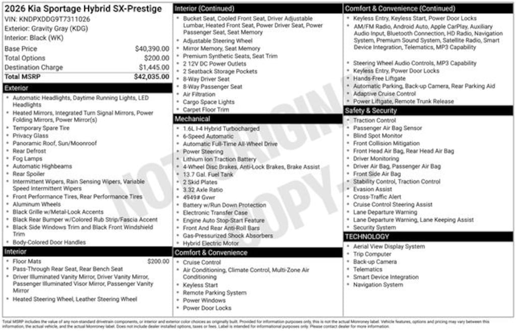 Visit our Website for a Complimentary CarFax Report!!!, Free First Oil Change, Auto Reward Program, 1.6L Turbo GDI 4-Cylinder, 4-Wheel Disc Brakes, 8 Speakers, ABS brakes, Air Conditioning, Alloy wheels, AM/FM radio: SiriusXM, Auto High-beam Headlights, Automatic temperature control, Brake assist, Bumpers: body-color, Carpeted Floor Mats, Compass, Delay-off headlights, Driver door bin, Driver vanity mirror, Dual front impact airbags, Dual front side impact airbags, Electronic Stability Control, Emergency communication system, Four wheel independent suspension, Front anti-roll bar, Front Bucket Seats, Front Center Armrest, Front dual zone A/C, Front fog lights, Front reading lights, Fully automatic headlights, harman/kardon® Speakers, Heated & Ventilated Front Bucket Seats, Heated door mirrors, Heated front seats, Heated steering wheel, Illuminated entry, Leather steering wheel, Low tire pressure warning, Memory seat, Navigation System, Occupant sensing airbag, Outside temperature display, Overhead airbag, Overhead console, Panic alarm, Passenger door bin, Passenger vanity mirror, Power door mirrors, Power driver seat, Power Liftgate, Power moonroof, Power passenger seat, Power steering, Power windows, Radio: AM/FM/HD Premium Audio System, Rain sensing wipers, Rear anti-roll bar, Rear reading lights, Rear seat center armrest, Rear side impact airbag, Rear window defroster, Rear window wiper, Remote keyless entry, Security system, Speed control, Speed-sensing steering, Split folding rear seat, Spoiler, Steering wheel mounted audio controls, SynTex Premium Leatherette Seat Trim, Tachometer, Telescoping steering wheel, Tilt steering wheel, Traction control, Trip computer, Turn signal indicator mirrors, Variably intermittent wipers, Ventilated front seats, Wheels: 19" x 7.5J Alloy, 1.6L Turbo GDI 4-Cylinder. 2026 Kia Sportage Hybrid SX-Prestige SX-Prestige 1.6L Turbo GDI 4-Cylinder AWD Gravity Gray Price includes: $1000 - KFA Dealer Choice Program: $1000 discount and 5.25% APR for 36 months. $30.08 per $1000 financed. Available to well qualified buyers who finance through Kia Finance America. 506. Exp. 12/01/2025