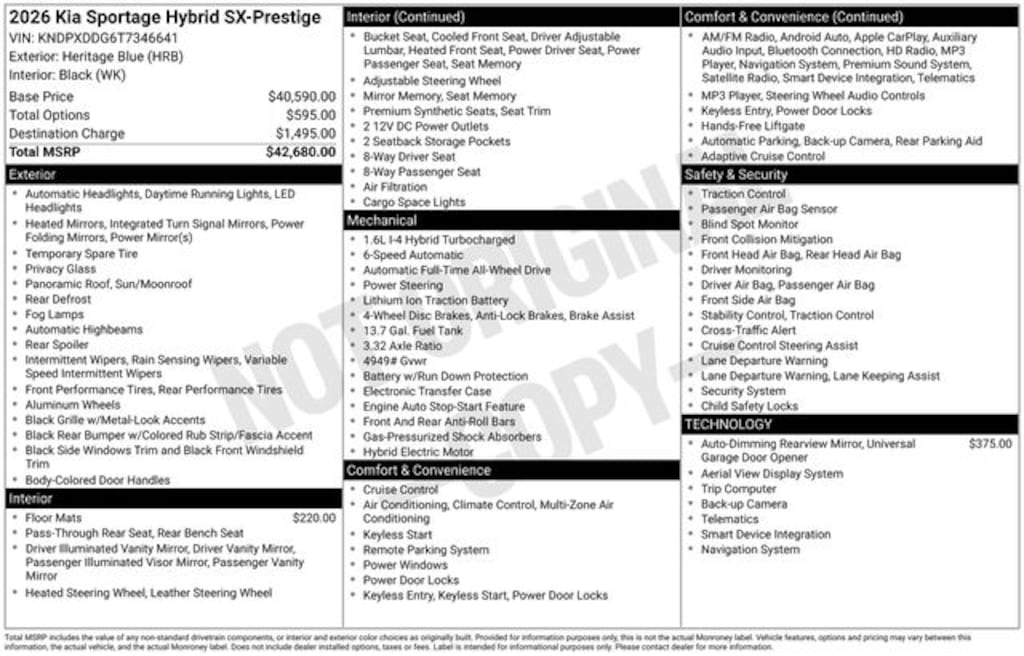 Visit our Website for a Complimentary CarFax Report!!!, Auto Reward Program, 1.6L Turbo GDI 4-Cylinder, 4-Wheel Disc Brakes, 8 Speakers, ABS brakes, Air Conditioning, All Weather Floor Mats, Alloy wheels, AM/FM radio: SiriusXM, Auto High-beam Headlights, Auto-Dimming Mirror with HomeLink, Automatic temperature control, Brake assist, Bumpers: body-color, Compass, Delay-off headlights, Driver door bin, Driver vanity mirror, Dual front impact airbags, Dual front side impact airbags, Electronic Stability Control, Emergency communication system, Four wheel independent suspension, Front anti-roll bar, Front Bucket Seats, Front Center Armrest, Front dual zone A/C, Front fog lights, Front reading lights, Fully automatic headlights, harman/kardon® Speakers, Heated and Ventilated Front Bucket Seats, Heated door mirrors, Heated front seats, Heated steering wheel, Illuminated entry, Leather steering wheel, Low tire pressure warning, Memory seat, Navigation System, Occupant sensing airbag, Outside temperature display, Overhead airbag, Overhead console, Panic alarm, Passenger door bin, Passenger vanity mirror, Power door mirrors, Power driver seat, Power Liftgate, Power moonroof, Power passenger seat, Power steering, Power windows, Radio: AM/FM/HD Premium Audio System, Rain sensing wipers, Rear anti-roll bar, Rear reading lights, Rear seat center armrest, Rear side impact airbag, Rear window defroster, Rear window wiper, Remote keyless entry, Security system, Speed control, Speed-sensing steering, Split folding rear seat, Spoiler, Steering wheel mounted audio controls, Syntex Premium Leatherette Seat Trim, Tachometer, Telescoping steering wheel, Tilt steering wheel, Traction control, Trip computer, Turn signal indicator mirrors, Variably intermittent wipers, Ventilated front seats, Wheels: 19" x 7.5J Alloy, 1.6L Turbo GDI 4-Cylinder. 2026 Kia Sportage Hybrid SX-Prestige SX-Prestige 1.6L Turbo GDI 4-Cylinder AWD Heritage Blue Price includes: $2000 - KFA Dealer Choice Program: $2000 discount and 5.25% APR for 36 months. $30.08 per $1000 financed. Available to well qualified buyers who finance through Kia Finance America. 506. Exp. 03/02/2026