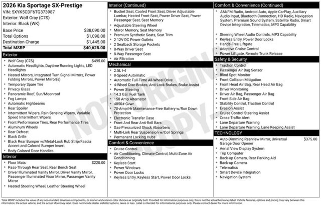 Visit our Website for a Complimentary CarFax Report!!!, Free First Oil Change, Auto Reward Program, AWD, 4-Wheel Disc Brakes, 8 Speakers, ABS brakes, Air Conditioning, All Weather Mats, Alloy wheels, AM/FM radio: SiriusXM, Auto High-beam Headlights, Auto-Dimming Mirror w/HomeLink, Automatic temperature control, Brake assist, Bumpers: body-color, Compass, Delay-off headlights, Driver door bin, Driver vanity mirror, Dual front impact airbags, Dual front side impact airbags, Electronic Stability Control, Emergency communication system: Kia Connect (includes 1 year free trial), Four wheel independent suspension, Front anti-roll bar, Front Bucket Seats, Front Center Armrest, Front dual zone A/C, Front fog lights, Front reading lights, Fully automatic headlights, harman/kardon® Speakers, Heated & Ventilated Front Bucket Seats, Heated door mirrors, Heated front seats, Heated steering wheel, Illuminated entry, Leather Shift Knob, Leather steering wheel, Low tire pressure warning, Memory seat, Navigation System, Occupant sensing airbag, Outside temperature display, Overhead airbag, Overhead console, Panic alarm, Passenger door bin, Passenger vanity mirror, Power door mirrors, Power driver seat, Power Liftgate, Power moonroof, Power passenger seat, Power steering, Power windows, Radio: AM/FM/HD Premium Audio System, Rain sensing wipers, Rear anti-roll bar, Rear reading lights, Rear seat center armrest, Rear side impact airbag, Rear window defroster, Rear window wiper, Remote keyless entry, Security system, Speed control, Speed-sensing steering, Split folding rear seat, Spoiler, Steering wheel mounted audio controls, SynTex Premium Leatherette Seat Trim, Tachometer, Telescoping steering wheel, Tilt steering wheel, Traction control, Trip computer, Turn signal indicator mirrors, Variably intermittent wipers, Ventilated front seats, Wheels: 19" x 7.5J Alloy, AWD. 2026 Kia Sportage SX-Prestige SX-Prestige I4 AWD Wolf Gray Price includes: $1500 - KFA Dealer Choice Program: $1500 discount and 5.25% APR for 36 months. $30.08 per $1000 financed. Available to well qualified buyers who finance through Kia Finance America. 506. Exp. 12/01/2025