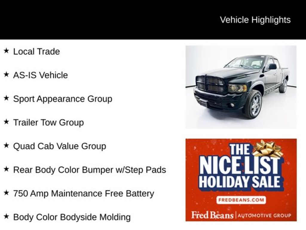 Recent Arrival! 2004 Dodge Ram 1500 SLT HEMI Magnum 5.7L V8 SMPI 5-Speed Automatic 4WD 4D Quad Cab Black Clearcoat Local Trade, AS-IS Vehicle, HEMI Magnum 5.7L V8 SMPI, 4WD, 17" x 8" Machined Cast Aluminum Wheels, 7 Pin Wiring Harness, 750 Amp Maintenance Free Battery, Body Color Bodyside Molding, Body Color Grille, Class IV Receiver Hitch, Front Body Color Fascia, Leather Wrapped Steering Wheel, Quad Cab Value Group, Rear Body Color Bumper w/Step Pads, Sport Appearance Group, Steering Wheel Mounted Audio Controls, Trailer Tow Group.
