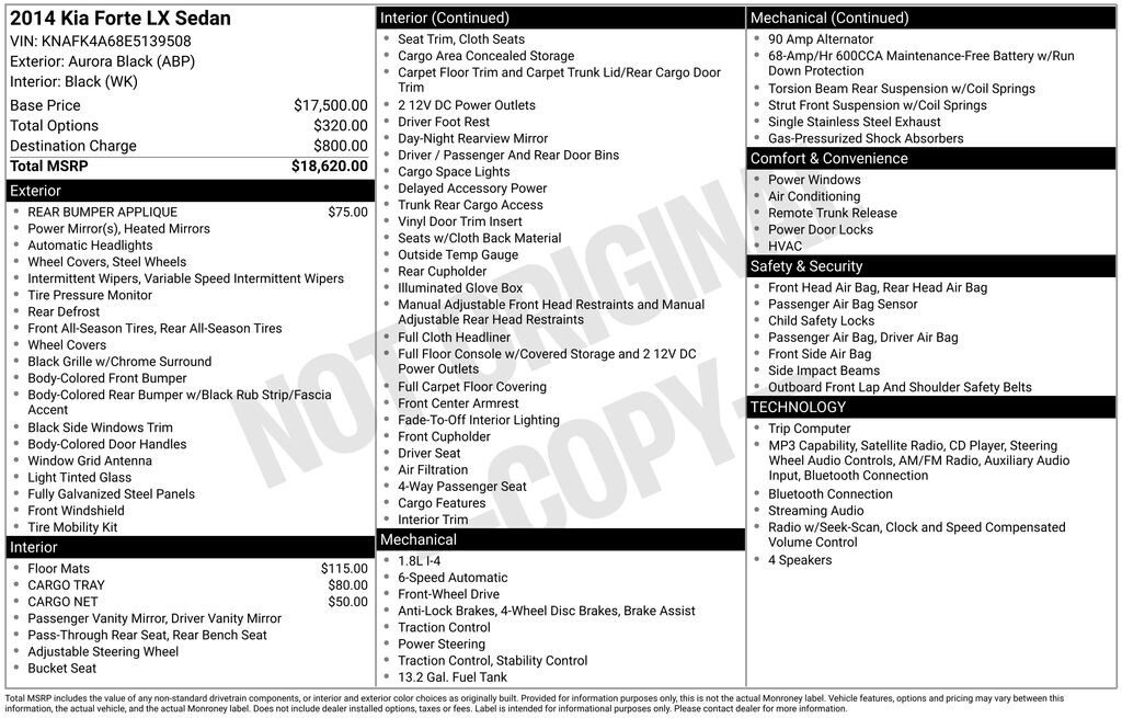 Under the hood, you'll find a peppy 1.8L I4 DOHC Dual CVVT engine mated to a smooth-shifting 6-Speed Automatic transmission, providing an engaging and efficient driving dynamic. With an EPA-estimated 25 city/36 highway mpg, this Forte will keep you on the road longer between fill-ups.